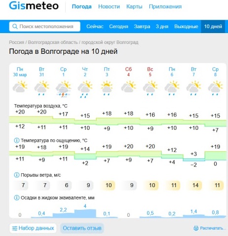 А вот 1 апреля электронный сервис предлагает ждать отдельного погодного сюрприза. В этот день в городе прогремит гроза. Кстати, первая в этом сезоне! Ожидается туман, небольшой дождь. Будет облачно, а столбики термометров чуть приубавят свой накал — до +17. В четверг в Волгограде дожди не прекратятся, температура упадет до +15. Небольшой дождь, скорее всего, пройдет у нас и в пятницу. До субботы термометры будут держаться на отметке до +18. В воскресенье снова пойдет дождь, а на термометрах — уже до +16.