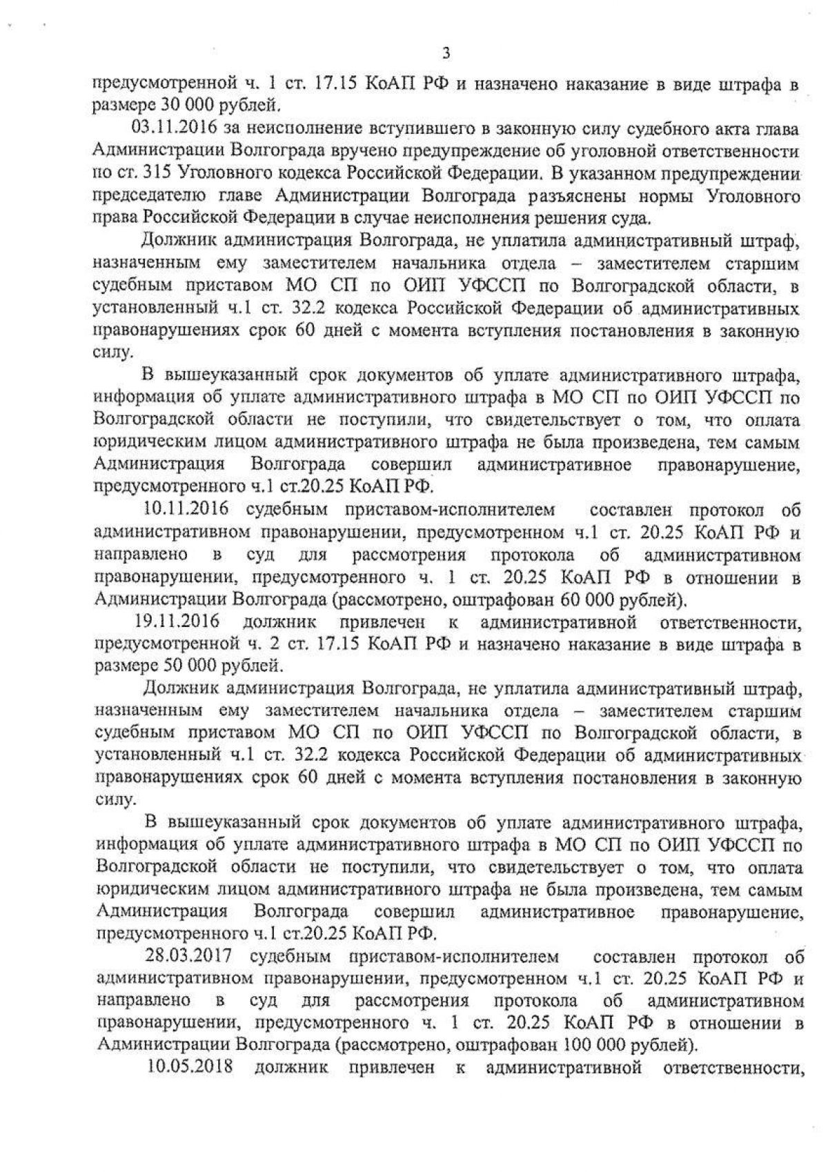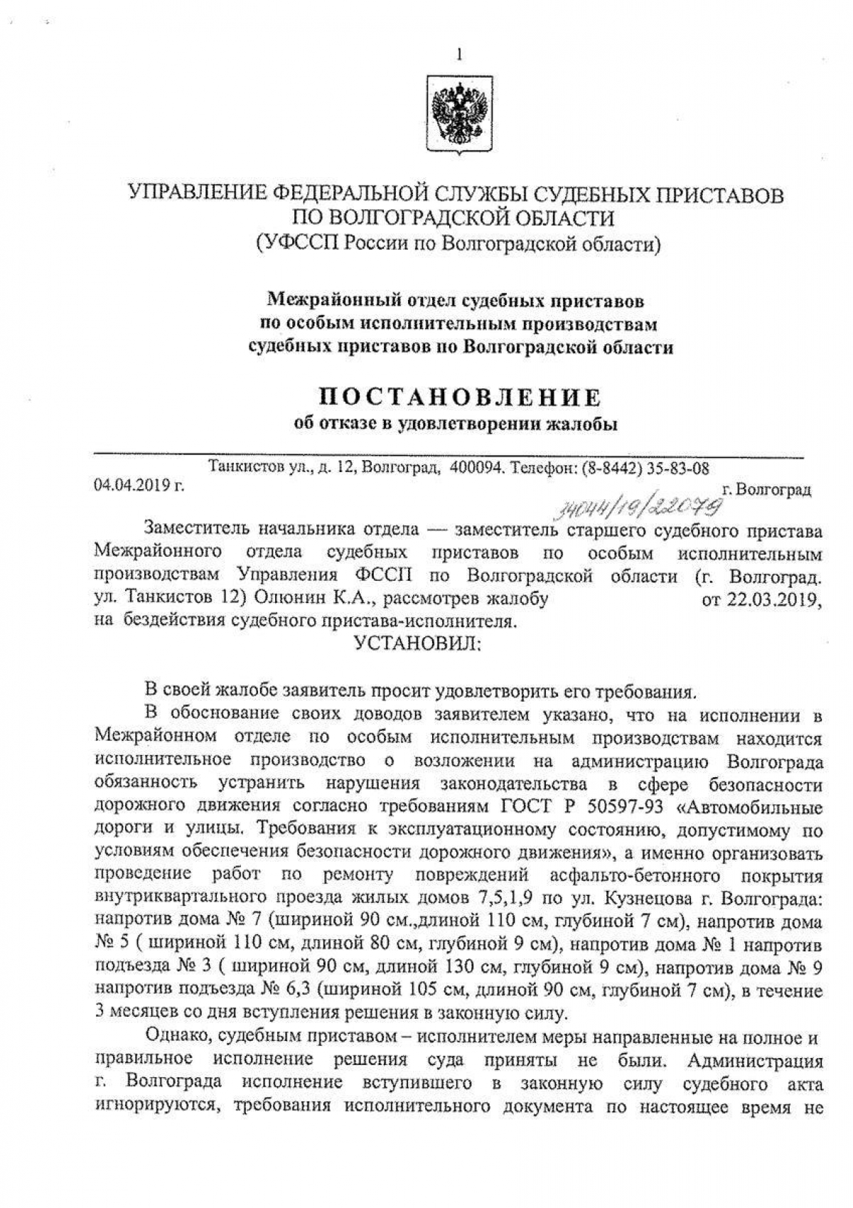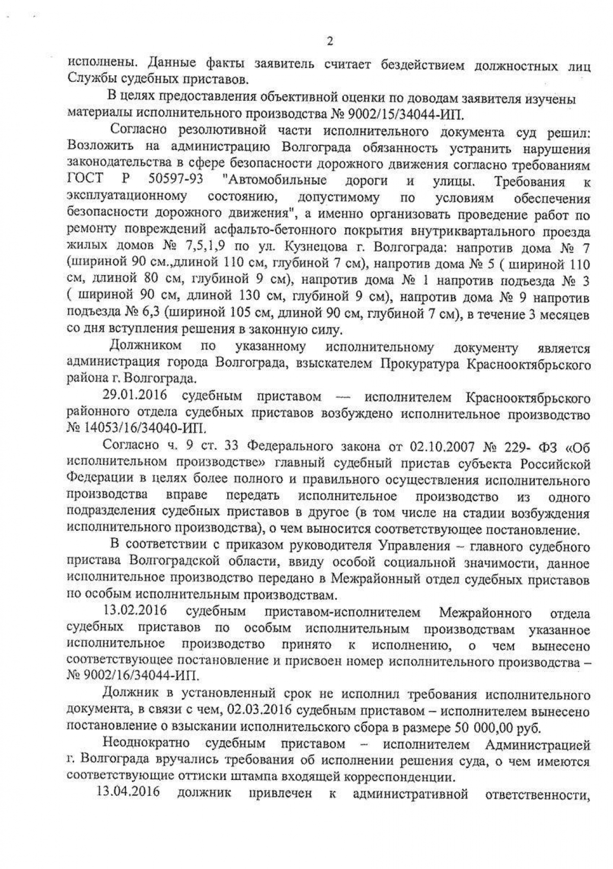 В 2015 году местные жители начали писать жалобы на разбитую дорогу. Прокуратура дважды судилась с администрацией и иски выигрывала. 3 сентября 2015 года Центральный районный суд удовлетворил требования прокурора в части устранения дефектов асфальта на участке внутридворовой территории. Со дня вступления приговора в законную силу у администрации было 3 месяца. В 2016 году состоялось еще одно судебное заседание, которое выиграла прокуратура. На исполнение решения Центрального районного суда у волгоградской мэрии было уже 6 месяцев. Однако на дворе 2019 год, а дорога по-прежнему разбита.