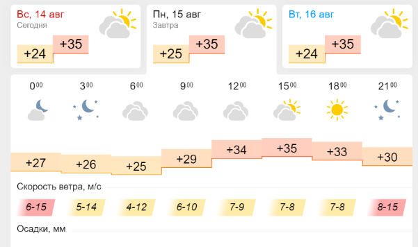 Прогноз погоды на всю неделю можно уже посмотреть здесь. Обещают, что с середины недели столбик термометра начнет постепенно опускаться вниз. Так, уже в воскресенье температура воздуха будет примерно 29 градусов, по данным Gismeteo.