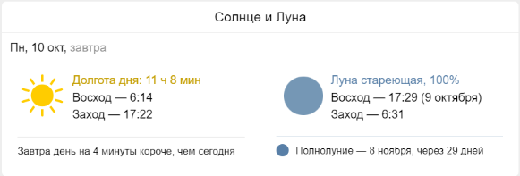 Солнце взойдет в 6:14 и закатится за горизонт уже к 17:22. А еще сегодня и завтра Луна будет полной. Скоро она будет убывать и стареть.