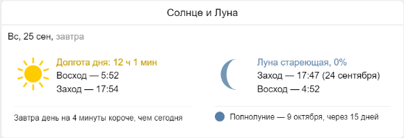 Почти весь день на небе не будет прояснений. Лишь в 9:00 на несколько минут выглянет солнышко. Зайдёт за горизонт оно, кстати, уже в 17:54. Это на 4 минуты короче, чем было вчера. Луна сейчас стареющая. До полнолуния осталось еще 15 дней. Оно случится 9 октября.