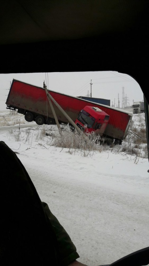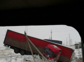 Водитель грузовика не справился с управлением на скользкой дороге и вылетел в кювет. Грузовик буквально свернуло пополам, кабина оказалась прижата вплотную к прицепу, а длинный прицеп повис посередине на земляном валу.