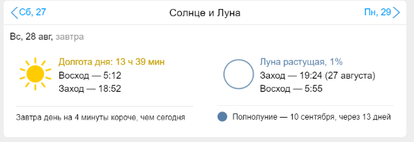 Солнце взойдет в 5:12, а закатится уже в 18:52. День становится значительно короче. Луна восходящая.