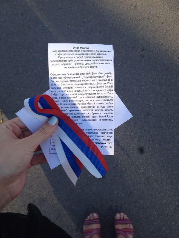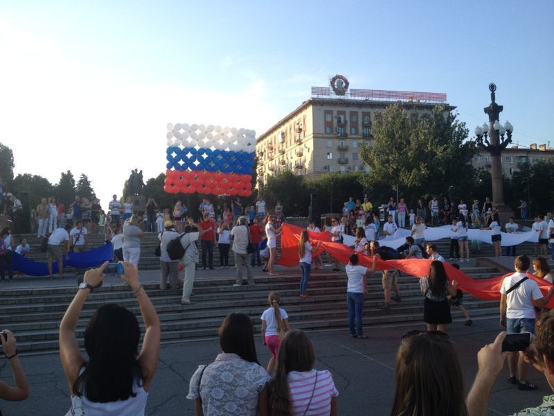 Акция прошла под лозунгом "Мы вместе - под флагом России". Помимо самого зрелищного запускания воздушного триколора в небо, для волгоградцев на набережной работал художник по аквагриму. И всем пришедшим были подарены ленточки с Государственным флагом, а также листовки со значением цветов флага РФ. Отметим, что в центре Волгограда на данное торжественное мероприятие собралось около 300 горожан. Несмотря на всю положительную атмосферу, был и один небольшой минус - флаг из шаров не поднялся высоко его запускали на леске, после чего унесли. Новости на Блoкнoт-Волгоград