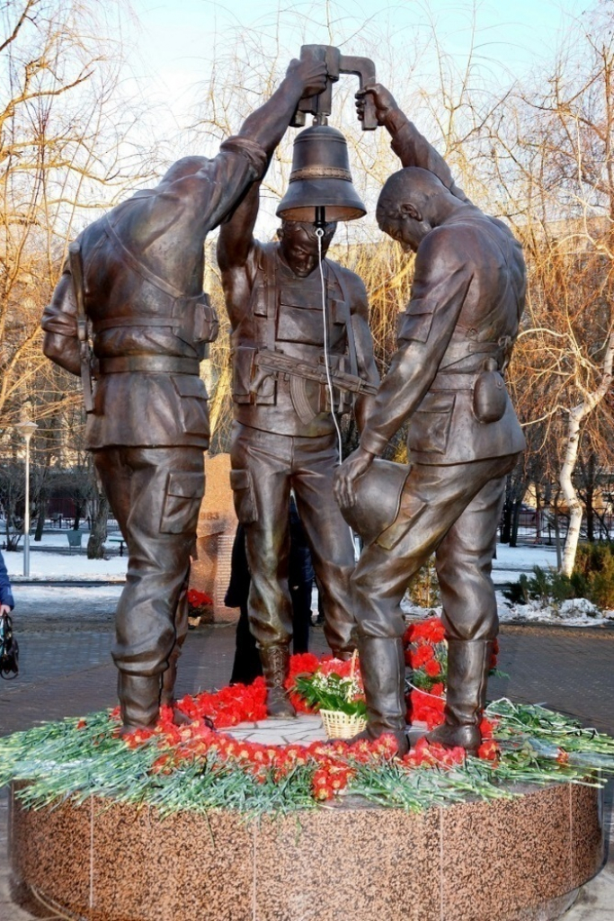 - Сюжет скульптуры классический – три фигуры, внутри которых ограниченное пространство, как локальная война, – поделился мастер художественным замыслом. – Центром напряжения композиции является колокол, который в день вывода войск должен звучать в память о тех, кто не вернулся. Также в парке расположены стелы, с именами 176 наших земляков, погибших в Афганистане.