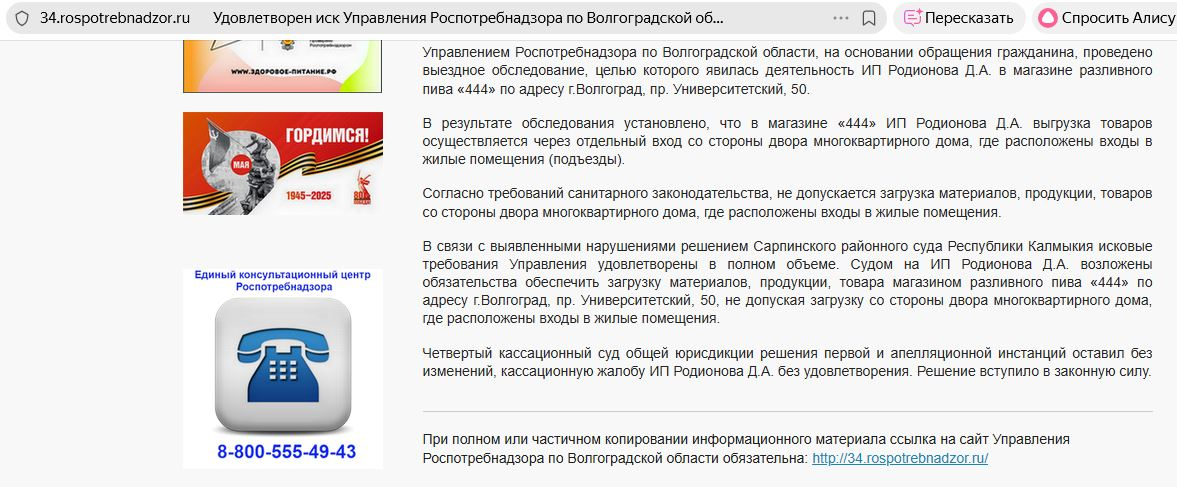 Решением Сарпинского районного суда Республики Калмыкия исковые требования Управления удовлетворены в полном объеме. На ИП Родионова Д.А. возложены обязательства обеспечить загрузку своего магазина другим образом.