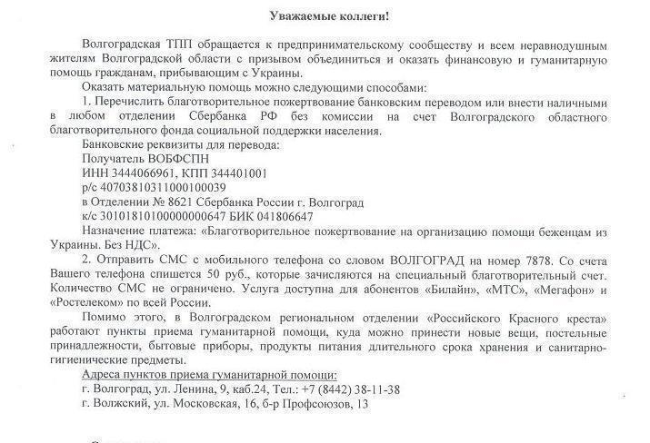 Всех неравнодушных жителей Волгограда и области региональная ТПП призывает объединиться и оказать финансовую и гуманитарную помощь.