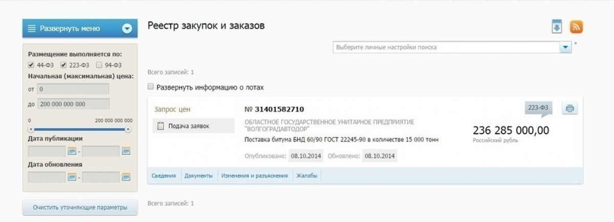 Согласно информации с сайта госзакупок. волгоградское предприятие ОГУП "Волгоградавтодор" запланировало закупить 15 тысяч тонн битума. Найдя поставщика, предприятие разместило на сайте госзакупок заявку, где требуемая сумма. исходя из средней цены на битум, несколько завышена - примерно на 80 миллионов.