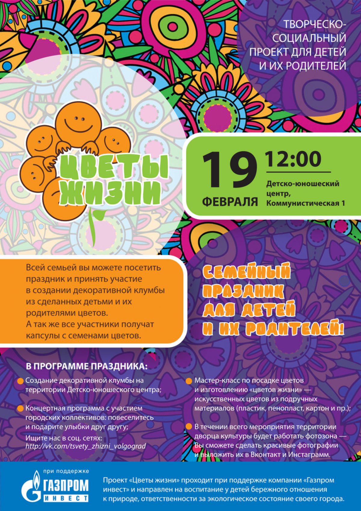 Новый творческо-социальный проект начинается 17 февраля в Волгограде. «Цветы жизни» - это программа развития детского и семейного творчества в городской среде, которая проходит при поддержке компании «Газпром инвест».
